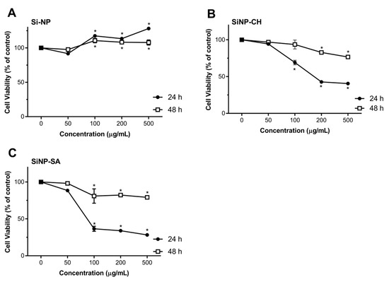 Effect of uncoated and coated SiNP on viability of HepG2 cells after 24 or 48 h exposure to 50, 100, 200 and 500 µg/mL of SiNP (A), SiNP-CH (B) and SiNP-CH (C) Cell viability is expressed as % of control (n = 8) and data are presented as means ± SD. Statistical difference between control group and formulations is reported as * p ˂ 0.05.