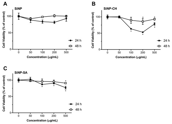 Effect of uncoated and coated SiNP on viability of Caco-2 cells after 24 or 48 h exposure to 50, 100, 200 and 500 µg/mL of SiNP (A), SiNP-CH (B) and SiNP-CH (C). Cell viability is expressed as % of control (n = 8) and data are presented as means ± SD. Statistical difference between control group and formulations is reported as * p ˂ 0.05.