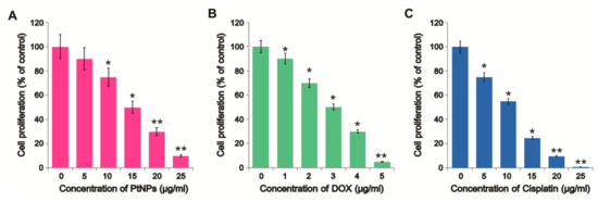 Figure 3. Dose-dependent effect of PtNPs, DOX, and CIS on U2OS cell proliferation. U2OS cell proliferation was determined after exposure to different concentrations of (A) PtNPs (5–25 µg/mL) or (B) DOX (1–5 µg/mL) or (C) CIS (5–25 µg/mL) for 24 h. Results are expressed as the mean ± standard deviation of three independent experiments. Differences between the treated and control groups were measured using Student’s t-test and statistically significant differences are indicated by * (p < 0.05). The results are presented as mean ± standard deviation of three experiments. * p < 0.05 was considered significant; ** p < 0.01 was considered highly significant and *** p < 0.001 was considered very highly significant.