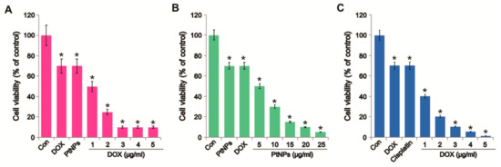Figure 2. Dose-dependent effect of PtNPs, DOX, and CIS on U2OS cell viability. U2OS cell viability determined after exposure to different concentrations of (A) PtNPs (5–25 µg/mL), (B) DOX (1–5 µg/mL), or (C) CIS (5–25 µg/mL) for 24 h. Results are expressed as the mean ± standard deviation of three independent experiments. Differences between the treated and control groups were measured using Student’s t-test and statistically significant differences are indicated by * (p < 0.05). * p < 0.05 was considered significant; ** p < 0.01 was considered highly significant and *** p < 0.001 was considered very highly significant.