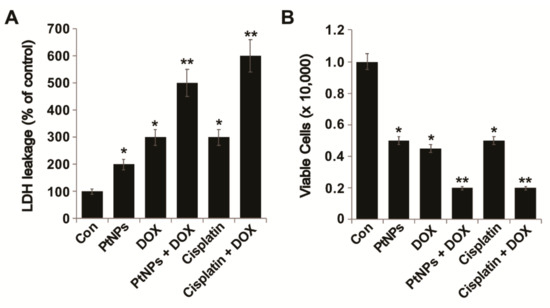 Figure 6. PtNPs and DOX increase LDH leakage and cell death. U2OS cells were treated with PtNPs (10 μg/mL), DOX (1 μg/mL), CIS (5 μg/mL), or a combination of PtNPs (10 μg/mL) and DOX (1 μg/mL) or combination of DOX (1 μg/mL) and CIS (5 μg/mL) for 24 h. (A) LDH activity was measured at 490 nm using an LDH cytotoxicity kit; (B) cell death was quantified using a trypan blue assay. At least three independent experiments were performed for each sample. Differences between the treated and control groups were measured using Student’s t-test and statistically significant differences are indicated by * (p < 0.05). The results are presented as mean ± standard deviation of three experiments. * p < 0.05 was considered significant; ** p < 0.01 was considered highly significant and *** p < 0.001 was considered very highly significant.