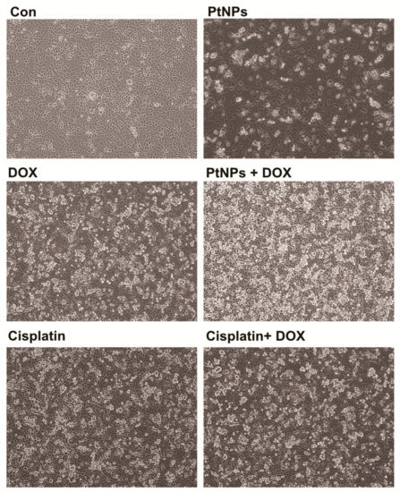 To determine the impact of PtNPs and DOX on cell morphology, an optical microscope was used to monitor cell structure; untreated U2OS cells were compared with those treated with PtNPs (10 μg/mL), DOX (1 μg/mL), CIS (5 μg/mL), or a combination of PtNPs (10 μg/mL) and DOX (1 μg/mL) or combination of DOX (1 μg/mL) and CIS (5 μg/mL) for 24 h. The control cells were round and polygonal in shape and formed irregular confluent aggregates, whereas cells treated with either PtNPs or DOX had a narrow, spherical shape. Following the treatment of U2OS cells with PtNPs (10 μg/mL), DOX (1 μg/mL), or a combination of PtNPs (10 μg/mL) and DOX (1 μg/mL) for 24 h, obvious morphological changes, apoptotic features, and chromatin condensation were observed (Figure 7). The control cells appeared normal in shape and were attached to the surface, whereas those exposed to PtNPs and DOX had lost their typical shape and cell adhesion capacity and reduced in size and cell density. The combination of CIS and DOX exhibited a significant effect on cell morphology comparable with PtNPs and DOX. Although the individual doses of both PtNPs and DOX altered cell morphology and induced apoptosis, the effect was much more pronounced for the combined dose. Ortiz-Lazareno [54] observed that the combination of MG132 and DOX induced multilobular nuclei, increased cytoplasmic volume, and membrane blebbing in U937 leukemia cells, suggesting that U937 cells exhibit signs of morphological membrane damage and apoptosis. Our findings agree with this study and a previous report showing that AgNPs induce morphological changes in human cervical cancer cells [55]. These results clearly suggest that the toxic effects exerted by PtNPs and DOX-sensitize U2OS cells to the toxic effects of PtNPs and DOX, that the cytotoxic effect of PtNPs and DOX could be due to their antineoplastic nature and ability to induce cell death via numerous molecular mechanisms, and that the combination of PtNPs and DOX could induce U2OS cell apoptosis.