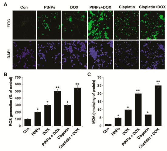 Figure 8. PtNPs and DOX induce ROS generation and lipid peroxidation in U2OS cells. U2OS cells were treated with PtNPs (10 μg/mL), DOX (1 μg/mL), CIS (5 μg/mL), or a combination of PtNPs (10 μg/mL) and DOX (1 μg/mL) or combination of DOX (1 μg/mL) and CIS (5 μg/mL) for 24 h. (A) ROS generation was measured using DCFH-DA-FITC with fluorescence microscopy. (B) Spectrophotometric ROS analysis was performed using DCFH-DA. (C) MDA concentrations were measured using a thiobarbituric acid-reactive substances assay and expressed as nanomoles per milliliter. Differences between the treated and control groups were measured using Student’s t-test and statistically significant differences are indicated by * (p < 0.05). The results are presented as mean ± standard deviation of three experiments. * p < 0.05 was considered significant; ** p < 0.01 was considered highly significant and *** p < 0.001 was considered very highly significant. Scale bar: 200 µm.