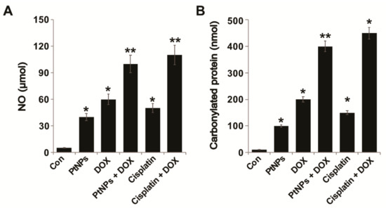 NO is an endogenous bioregulator that plays various critical pathophysiological roles. In tumor cells, NO levels play a vital role in proliferation; for instance, low NO levels are unable to control the proliferation, survival, and apoptosis of tumor cells [69]. Maximizing NO levels in cancer cells is necessary to obtain satisfactory therapeutic effects; therefore, we examined whether the combination of PtNPs and DOX could increase NO levels in U2OS cells. U2OS cells were treated with PtNPs (10 μg/mL), DOX (1 μg/mL), CIS (5 μg/mL), or a combination of PtNPs (10 μg/mL) and DOX (1 μg/mL) or combination of DOX (1 μg/mL) and CIS (5 μg/mL) for 24 h and then NO levels were measured. As shown in Figure 9A, incubation with PtNPs DOX and a combination of PtNPs and DOX had a significant effect compared with the control. As expected, treating cells with PtNPs and DOX caused a remarkable level of NO which correlated with reduced viability, indicating the significant cytotoxic effect of PtNPs and DOX. The combination of CIS and DOX exhibited significant effect on NO and carbonylated protein contents. Although individual doses of both PtNPs and DOX increased NO levels, the effect was much more pronounced for the combined dose. Recently, Cao et al. [70] demonstrated that PtNPs triggered a nine- to ten-fold increase in NO release from donors such as S-nitroso-N-acetylpenicillamine (SNAP) and S-nitrosoglutathione (GSNO), which is major cause of cytotoxic effects in A549 cells. Apigenin-functionalized PtNPs and vanillin-functionalized GOPtNPs increased NO levels in human monocytic THP-1 and prostate cancer (LNCaP) cells, respectively [23,46]. Collectively, these findings demonstrate that PtNPs and DOX triggered NO release, efficiently killing cancer cells.