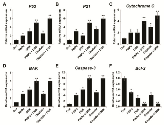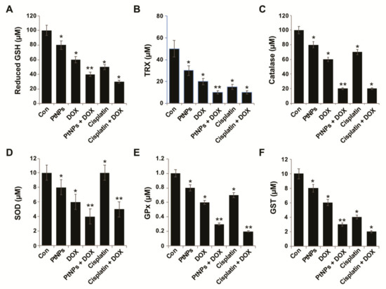 The expression levels of oxidative and antioxidative stress markers were measured as described previously [23]. PtNPs (10 μg/mL), DOX (1 μg/mL), CIS (5 μg/mL), or a combination of PtNPs (10 μg/mL) and DOX (1 μg/mL) or combination of DOX (1 μg/mL) and CIS (5 μg/mL) for 24 h. After the treatment, the cells were washed twice with PBS, scraped from the plates into ice-cold PBS (0.1 M, containing 0.05 mM EDTA), and homogenized. Further, the cell pellet was sonicated three times at 15 W for 10 s to obtain the cell lysate. The resulting supernatant was stored at −70 °C for further analysis. The homogenate was centrifuged at 4 °C at 10,000 rpm for 15 min, and the resulting supernatant was stored at 70 °C until analyzed. Protein concentration was determined using the Bradford method with bovine serum albumin (BSA) as a reference standard. The levels of antioxidative stress markers, reduced glutathione (GSH), thioredoxin (TRX), catalase (CAT), superoxide dismutase (SOD), glutathione peroxidase (GPx), and glutathione S-transferase (GST) were determined according to the manufacturer’s instructions.