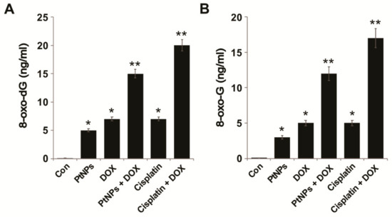 U2OS cells were treated with PtNPs (10 μg/mL), DOX (1 μg/mL), CIS (5 μg/mL), or a combination of PtNPs (10 μg/mL) and DOX (1 μg/mL) or combination of DOX (1 μg/mL) and CIS (5 μg/mL) for 24 h. 8-oxo-dG and 8-oxo-G contents were determined as described previously [23,24,25] and as per the manufacturer’s instructions (Trevigen, Gaithersburg, MD, USA). First, we prepared an appropriate number of 8-OHdG precoated well strips and then equilibrated with all reagents at room temperature; then, HRP-conjugated 8-OHdG antibody was added to either standards or samples in the appropriate wells. After incubation for 60 min, all unbound reagents were removed. Finally, the absorbance was measured with an ELISA plate reader set at 450 nm.
