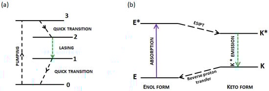 Energy diagrams of (a) the four-level laser system and (b) the excited-state intramolecular proton transfer (ESIPT) photocycle.