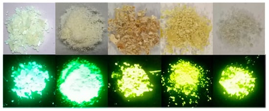 Photographs of HBO 1–5 (from left to right) as powders under daylight (top) and under irradiation at λexc = 365 nm (bottom).