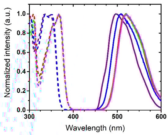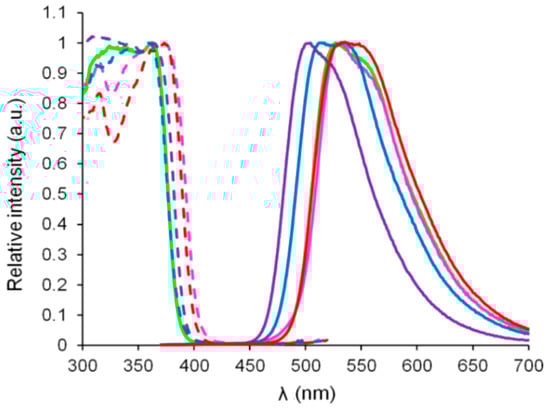 The excitation and emission spectra of HBO 1–5 recorded in KBr pellets adopted similar shapes and maximal emission wavelengths as in toluene, i.e., an intense, poorly structured single K* band located in the green–yellow region (λem = 504–534 nm) (Figure 5). Encapsulation of these ESIPT emitters in a confined matrix led to a significant enhancement of the fluorescence quantum yields, which were calculated to range from 53% to 82%. In doped PMMA films, a single emission profile, corresponding to the decay of K* band was observed for all dyes. The emission wavelengths spanned from 490–521 nm (Figure 6). This photophysical behavior indicated a strong dependence of the emission profile on the vicinal environment of the dye, a feature frequently encountered for ESIPT probes. It is noteworthy that the quantum yields in PMMA films were significantly lower than in KBr pellets (Φ = 20–49%).