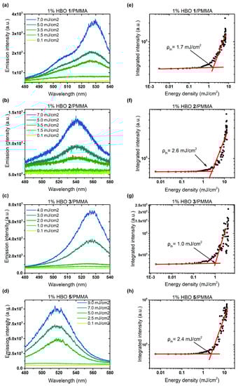 The RL studies were performed for samples with varying dye loadings (see the Supplementary Materials for details). Both coherent and incoherent RL was observed for all studied ESIPT dyes. With the increase of the pumping energy density, the gain started to overcome the losses, which resulted in an increase of the intensity along with the narrowing of the emission profile. Representative spectra of RL for HBO dyes 1–3 and 5 are given in Figure 8a–d (and S7, Figure S7.4), while the integrated emission intensity dependence on the exciting energy density is presented in the log–log scale in Figure 8e–h. The RL studies on HBO 4 have been reported elsewhere []. The stimulated emission occurs above the threshold level of pumping energy density, as evidenced by a rapid increase of the emission intensity.
