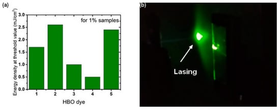 (a) Difference between random lasing threshold values for 1% samples of HBO dyes 1–5 in PMMA matrix and (b) a photography of the stimulated emission above the RL threshold observed for 1% doped HBO 5 in the PMMA sample.