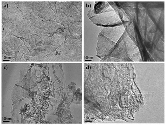On the other hand, the HDI-GO samples display a homogeneous and uniform appearance (Figure 1b), with a stacked-like structure, comprising flexible and slightly curled flakes with an average thickness of 20 nm. It should be noted that this thickness is significantly higher than that reported for a single monolayer graphene (about 0.34 nm [24]) due to the presence of oxygen-containing functional groups and the alkyl chains of the organic diisocyanate attached on both sides of the flakes. Further, each sample contains several modified graphene layers. The darker areas in Figure 1b are probably related to different thicknesses or disposition of the nanosheets due to the presence of the HDI. This is in agreement with former observations described by other authors who anchored alkyl or polymeric chains onto graphene [25,26]. In accordance with those works, the grafted chains extend into the solution, but in the solid state the chains collapse onto the GO surface, forming small domains that probably correspond to more-obscure features. It is also important to mention that the HDI-GO samples show a lower degree of folding than typically observed for pristine GO [27], since the alkyl chains can wrap around the GO nanosheets and shield the wrinkles.