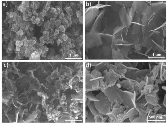 Further information about the morphology of the samples was attained by SEM, and typical images are shown in Figure 2. Figure 2a reveals nano- and meso-particles of PPy-COOH with spherical morphology and a smooth surface arranged in random clusters showing an average particle diameter of 110 nm. Regarding the HDI-GO (Figure 2b), it is composed of flexible and quite well-exfoliated flakes, with thicknesses between 10 and 50 nm and lateral sizes of 1–2 μm. Conversely, PPy-COOH-g-HDI-GO-2 (Figure 2c) appears as a homogenous sample with the graphene nanosheets randomly dispersed within the PPy-COOH particles. The sheets are less bendable and appear with a smoother surface than those in HDI-GO, probably due to the grafting of the polymeric, and appear thicker, with thicknesses of up to 70 nm, as can be observed at a higher magnification (Figure 2d). Similar morphology, albeit with thinner sheets and uneven HDI-GO dispersion, was found for PPy-COOH-g-HDI-GO-1. From all the above observations, it can be inferred that the esterification reaction via acylation with thionyl chloride leads to higher grafting yields, hence larger amounts of polymer chains anchored to the nanofiller surface, which will be discussed in the following sections.
