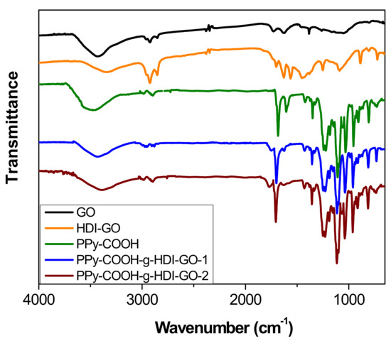 The chemical changes that took place after treatment of PPy-COOH with HDI-GO were examined by FT-IR spectroscopy (Figure 3). For comparative purposes, the spectrum of pristine GO was also examined. Neat GO encloses epoxide and hydroxyl groups on the basal planes and carboxylic acids at the flake edges [11,15]. The most distinctive characteristics in the IR spectrum of GO are found at ~3435 cm−1, ascribed to the O–H stretching; at about 2930 and 2850 cm−1, attributed to sp2 and sp3 C–H stretching vibrations (formed at defect sites of the aromatic system); at 1730 cm−1 due to the C=O stretching of the carboxylic group; at ~1620 cm−1, ascribed to the C–C stretching of the aromatic network; at around 1400 cm−1, corresponding to the O–H deformation; and at 1260 cm−1, due to the C–OH stretching [30].