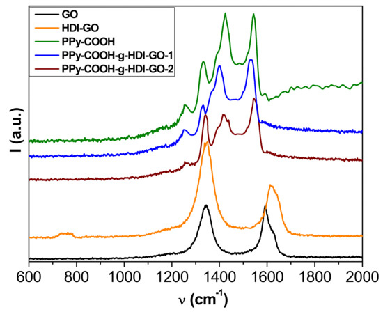 Raman spectra of GO, HDI-GO, PPy-COOH, PPy-COOH-g-HDI-GO-1, and PPy-COOH-g-HDI-GO-2.