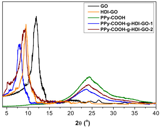 The different samples were also analyzed by XRD measurements, and representative diffractograms of PPy-COOH, GO, HDI-GO and the two grafted samples are compared in Figure 6. GO shows a typical peak at 2θ = 11.8° ascribed to the (002) crystalline plane [11], which corresponds to an interlayer d spacing of 0.748 nm according to the Bragg’s equation [43]. In the HDI-GO, the diffraction peak shows lower intensity and appears at 2θ = 9.2°, which corresponds to a d value of 0.961 nm. This increase in the d spacing is ascribed to the intercalation of the alkyl chains between the GO layers, as reported previously for other polymer/GO nanocomposites [44,45].