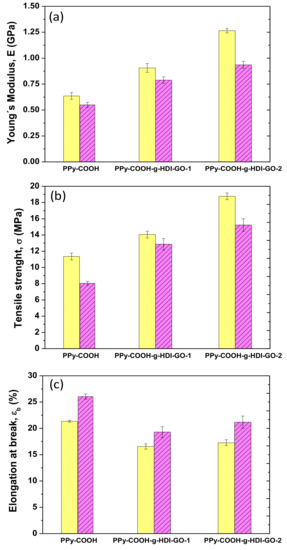 The mechanical properties of PPy-COOH and the grafted samples were explored by tensile measurements at 25 and 100 °C, and their Young´s (or elastic) modulus, tensile strength, and elongation (or strain) at break are plotted in Figure 7. At 25 °C, PPy-COOH exhibits elastic modulus and tensile strength values of 0.62 GPa and 11 MPa, respectively. The grafting of the HDI-GO causes large enhancements in both modulus and strength (Figure 7a,b) by about two-fold and 73%, respectively, for the sample with the highest grafting efficiency. An analogous tendency, though with somewhat lower increases, is found for the PPy-COOH-g-HDI-GO-1. The exceptional modulus and strength improvements attained demonstrate the high reinforcing efficiency of HDI-GO, likely arising from the strong PPy-COOH-HDI-GO interface adhesion achieved by the covalent bonding, therefore very effective load transfer from the PPy-COOH to the nanofiller sheets. A similar percentage of modulus increment was reported for a PEEK derivative covalently anchored to acid-functionalized SWCNTs [16]. The higher increment observed for PPy-COOH-g-HDI-GO-2 in comparison with the other grafted sample is likely associated with its higher yield of grafting. Furthermore, it is important to note that these samples contain a high GO content (~10 wt%), higher than the quantity typically incorporated in polymeric composites [49].