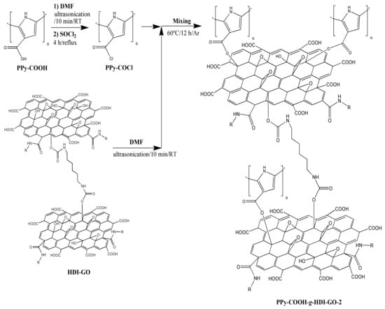 The second approach was performed via reaction of the carboxylic groups of the polymer with thionyl chloride to yield the acyl chloride derivative (Scheme 2). Firstly, PPy-COOH (300 mg) was dispersed in DMF (10 mL) and sonicated in a bath for 10 min. Then, an excess of SOCl2 (1 mL, 13.7 mmol) was added and the reaction took place for 4 h under reflux and constant stirring. Subsequently, the residual SOCl2 was eliminated by distillation under vacuum to produce the acyl-chloride-modified polymer (PPy-CO-Cl). Separately, HDI-GO (30 mg) was dispersed in DMF (10 mL) by sonication with the ultrasonic probe for 5 min combined with bath sonication for 30 min. Then, pyridine (2 mL) was added and the mixture was kept under stirring at 60 °C. After, PPy-CO-Cl was mixed with the HDI-GO dispersion and the reaction continued for 12 h at 60 °C under stirring and an inert atmosphere. The resulting compound, hereafter named as PPy-COOH-g-HDI-GO-2, was filtered, washed repeatedly with methanol, and dried under vacuum at 50 °C.