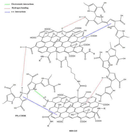 The peaks of HDI-GO cannot be observed in the spectra of PPy-COOH-g-HDI-GO-1 or PPy-COOH-g-HDI-GO-2, which is reasonable considering that the total amount of this modified GO is only 9% of the weight of the grafted samples, hence its bands should be very weak and masked by the polymer ones. Thus, the spectra of both samples is quite similar to that of the polymer, albeit with decreased intensity of the O–H stretching band due to the esterification of part the hydroxyl groups with the carboxylic acids of PPy-COOH. Nonetheless, as mentioned earlier, this reduction should be considered only as indicative since the peak intensity could have been affected by the stretching vibration of the water molecules in the environment. Further, the band is significantly shifted to lower wavenumbers, and appears at 3430 and 3388 cm−1 for PPy-COOH-g-HDI-GO-1 and PPy-COOH-g-HDI-GO-2, respectively. Besides, the band corresponding to the carboxylic acid shifts up to 1699 and 1708 cm−1, respectively, and this behavior might be an indication of H-bonding interactions between the OH and NH moieties of PPy-COOH and the oxygenated functional groups of the GO surface [33,34] (see Scheme 3). In addition, strong π-π stacking interactions take place between the aromatic rings of pyrrole and those of GO, as well as electrostatic interactions between the negatively charged carboxylic acid groups of the HDI-GO surface and the positively charged PPy-GOOH rings in the oxidized state (bipolaron structure), which would also induce a shift in the band positions. More importantly, after the grafting reactions, a new band appears at 1743 and 1760 cm−1 for PPy-COOH-g-HDI-GO-1 and PPy-COOH-g-HDI-GO-2, respectively, related to the C=O stretching of the ester group. The appearance of this band in the spectra of both grafted samples is one of the outmost outcomes derived from the IR analysis, given that it corroborates that part of the carboxylic acids of PPy-COOH have reacted with the hydroxyl moieties of the HDI-GO.