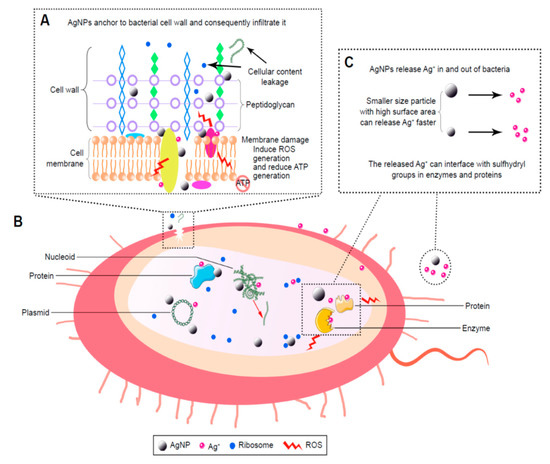 The bactericidal effects of AgNPs have been studied extensively by many researchers, however, antimicrobial mechanisms remain unclear and subject to debate. The controversy arises from whether a direct contact of AgNPs or released silver ion from AgNPs causing bactericidal effect [54,63,73]. For a direct contact-killing mechanism [81,82,83], AgNPs in the form of metallic silver adhere to the bacterial cell wall which causes a loss in membrane integrity, leading to the leakage of cytoplasmic contents and the generation of reactive oxygen species (ROS) such as hydrogen peroxide (H2O2), hydroxyl ion (OH−) and superoxide anion (O2−) (Figure 1A) [64]. As is known, bacterial membranes exhibit a negative surface charge due to the presence of carboxyl and phosphate groups. There exist favorable electrostatic interactions between positively charged AgNPs and negatively charge cell membranes, thereby facilitating AgNPs attachment onto bacterial cell walls [84,85]. Thus, the adherence of AgNPs to the bacterial cell wall can be enhanced by modulating the surface charge of nanoparticles. Once attached, AgNPs can also penetrate the membrane and inactivate intracellular components such as ribosome and mitochondria, thereby inhibiting protein synthesis, causing dysfunction of respiratory enzyme system, and reducing adenosine triphosphate (ATP) production. In addition, AgNPs may interact with intracellular proteins and deoxyribonucleic acid (DNA) biomolecules, resulting in the inhibition of cell replication and the generation of ROS (Figure 1B). Morones et al. have reported that the surface interactions of AgNPs with E. coli reduce the permeability and respiration functions of bacterial membrane. Furthermore, AgNPs also penetrate into cytoplasm and interact with protein and DNA, leading to final cell death. Further, AgNPs can release silver ions upon residing in the cytoplasm [86]. For silver-ion mediated cytotoxicity, released silver ions tend to interact with the thiol (sulfhydryl) groups of cell wall-bound enzymes and proteins, interfering with the respiratory chain and generating ROS. Moreover, those ions can infiltrate into the cytoplasm and react with the thiol groups of cytoplasmic proteins (Figure 1C) [86].