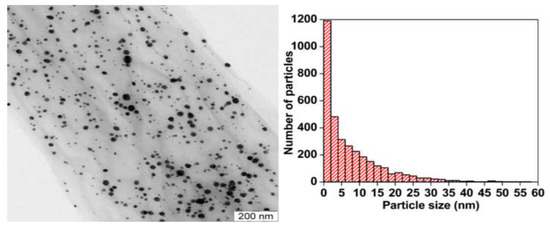 Transmission electron micrograph of GO-AgNPs (left panel) and the size distribution of AgNPs (right panel). The average size of AgNPs is 7.5 nm. Reproduced with permission from [72]. Copyright Elsevier, 2014.