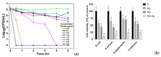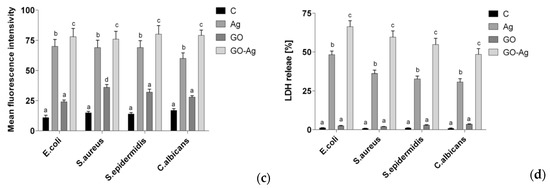 (a) Time-kill curves for P. aeruginosa at different concentrations of colloidal GO-AgNPs. The error bars represent the standard deviation of experiments performed in triplicates (n = 3). Reproduced with permission from [72], Copyright Elsevier, 2014. (b) Cell viability, (c) ROS level and (d) LDH leakage of thin foils coated with AgNPs, GO and GO-AgNPs upon exposure to E. coli, S. aureus, S. epidermidis and C. albicans; C is the control foil without nanoparticles. The columns with different letters (a–d) indicate significant differences between the foil samples exposed to bacterial strains and yeast (p = 0.001); error bars are standard deviations. Reproduced with permission from [137]. Copyright Springer Open, 2018.