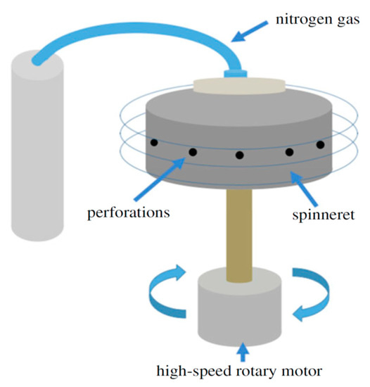 Schematic diagram of the pressurized gyration system for fabricating polymer fibers. Reproduced with permission from [44]. Copyright Royal Society, 2018.