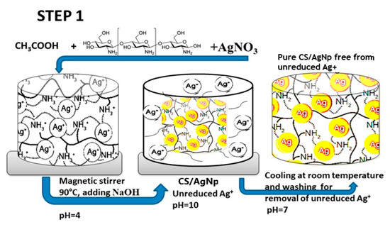 The synthesis of AgNPs is well documented in the literature [73,74,75,76], and briefly described herein. The wet chemical reduction route is widely adopted by the researchers to synthesize AgNPs. In the process, silver salt precursor (e.g., silver nitrate) is reduced by a reducing agent in the aqueous solution or organic solvent under the presence of a polymer-based capping agent or stabilizer. Sodium borohydride, ascorbic acid, glucose, hydrazine, sodium citrate, or ethylene glycol (EG) is employed as a reducing agent, while polyvinyl alcohol (PVA), polyvinylpyrrolidone (PVP), or polyethylene glycol (PEG) is used as a stabilizer [73]. However, this synthetic approach limits the use of AgNPs for biomedical applications due to the organic solvent and reductant involved are mostly toxic. These toxic chemicals include N,N-dimethylformamide (DMF), dimethyl sulfoxide (DMSO), hydrazine, and sodium borohydride. In this respect, biosynthesis of AgNPs using various biomolecules derived from the plant leaves, fruits and nuts has attracted considerable attention in recent years due to its cost-effective and environmentally friendly properties. This route offers greener and safer solution for the synthesis of AgNPs [77,78,79,80].