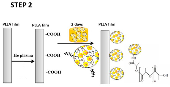 Very recently, Aflori et al. reacted chitosan (CS) with AgNO3 precursor to yield CS-AgNPs. CS acted as both capping and reducing agent for forming AgNPs (Figure 6; step 1). They then treated PLLA with helium plasma at 30 W for 4 min and 10 min, respectively in order to induce carboxyl groups on its surface [153]. The plasma-treated PLLA was immediately immersed in the CS-AgNPs solution at room temperature for 2 days. As such, CS-AgNPs were grafted onto PLLA due to the interactions between the carboxyl groups of plasma-treated PLLA and the amino groups of CS (Figure 6; step 2). Neat PLLA (P0), plasma-treated PLLA (4 min)/AgNPs (P1), and plasma-treated PLLA (10 min)/AgNPs (P2) films were exposed to different S. aureus strains and P. aeruginosa strains (Figure 7). P. aeruginosa is a leading cause of ventilator-associated pneumonia, bacteremia, and surgical wound infections [33]. Furthermore, multi-drug resistant strains of S. aureus and P. aeruginosa are often difficult to cure with conventional antibiotics. Comparing with PLLA, P1 and P2 films exhibited excellent antibacterial activity. In particular, antibacterial efficacy of P1 film was more pronounced against gram-negative P. aeruginosa than against S. aureus. This was due to P. aeruginosa had a thinner peptidoglycan wall.