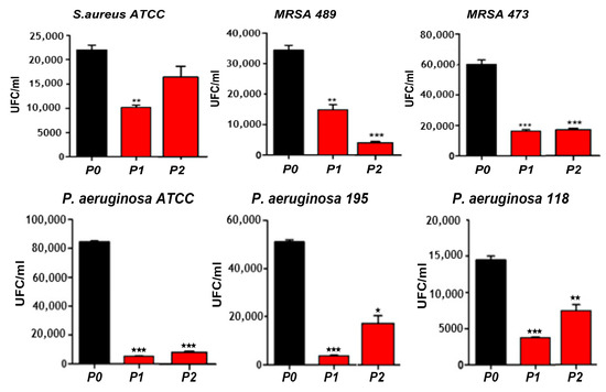 Bacterial population in colony forming unit (UFC/mL) of different S. aureus strains and P. aeruginosa strains adhered on P0, PI and P2 films. *, ** and *** correspond to the magnitude of antimicrobial activity. MRSA: Methicillin-resistant Staphylococcus aureus, and ATCC: American Type Culture Collection.