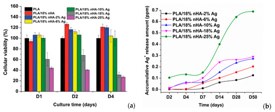 Generally, PLA also lacks of bioactive function and osteointegration. These can be improved by adding hydroxyapatite nanorod (nHA), a major mineral constituent of human bone, for enhancing bone cell adhesion and growth. Tjong and coworkers have fabricated PLA/18 wt% nHA–(2–25 wt%)AgNPs nanocomposites using melt-mixing and injection molding [154]. Figure 8a shows the 3-(4,5-dimethylthiazol-2-yl)-2,5-diphenyltetrazolium bromide (MTT) test results for human osteoblast cell line (Saos-2) cultured on PLA/nHA-AgNPs nanocomposites for different time points. The addition of 18 wt% nHA to PLA enhances osteoblastic cell viability at day 2 and day 4. The incorporation of 2 wt% and 10 wt% AgNPs into PLA/18 wt% nHA nanocomposite leads to a slight decrease in the bone cell viability. However, osteoblastic viability reduces significantly by adding 18 wt% AgNPs and 25 wt% AgNPs to PLA/18 wt% nHA at day 2 and day 4. A marked reduction in the cell viability at high AgNPs contents can be attributed to the cytotoxic effect of released Ag+ ions. As AgNPs fillers are firmly bound to the PLA matrix, they cannot penetrate osteoblastic membrane, so those fillers release Ag+ ions in reducing the viability of Saos-2. Figure 8b shows the released Ag+ profiles of PLA/18 wt% nHA–AgNPs hybrids immersed in distilled water at 37 °C. The amount of Ag+ cation is dependent on the AgNPs loadings. For the hybrid composites with low AgNPs loadings (e.g., 2 wt%), Ag+ cation release rate is very slow at an earlier stage of immersion (day 2–day 7). The polymer matrix shields AgNPs from direct contact with water, thus causing slow cation release. However, Ag+ cation contents increase moderately at day14 and above due to the PLA degradation as a result of polymer chain scission. In contrast, larger amounts of Ag+ ions are released from hybrid nanocomposites with AgNPs loadings ≥ 10 wt% at day 14 and above.