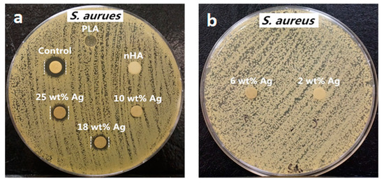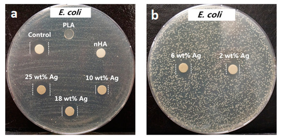 From the literature, AgNPs and Ag+ ions can also induce cytotoxicity to osteoblasts and other mammalian cells by generating ROS in a dose dependent manner, leading to mitochondrial dysfunction, DNA damage, protein denaturation, and apoptosis [155,156]. Thus, the amounts of AgNP in the PLA/18 wt% nHA–AgNPs hybrids must be regulated to avoid cytotoxic effect on osteoblasts. Figure 9a,b and Figure 10a,b show the disk diffusion test results of PLA and its hybrids upon exposure to E. coli and S. aureus, respectively. Neat PLA and PLA/18 wt% nHA exhibit no inhibition zone to E. coli and S. aureus as expected. The inhibition zone of PLA/18 wt% nHA–AgNPs hybrids against E. coli increases with increasing AgNP content. The bactericidal activity of these hybrids derives from the Ag+ ions. In addition, gram-positive S. aureus is less susceptible to AgNPs than E. coli. Hybrid nanocomposites with AgNPs contents ≤ 10 wt% exhibit no bacterial inhibition zones. The zones can be seen in the hybrids with high AgNPs contents, i.e., 18 wt% and 25 wt% AgNPs.