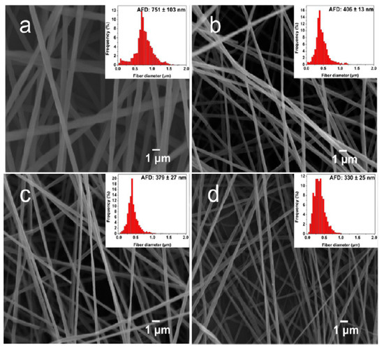 SEM images of electrospun (a) PLA, (b) PLA/1 wt% GO, (c) PLA/3 wt% Ag, and (d) PLA/1 wt% GO-3 wt% Ag fibrous mats. Reproduced from [165], Copyright American Chemical Society, 2017.