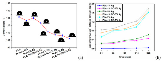 (a) Images of water contact angles on PLA and its nanocomposite fibrous mats, and (b) released Ag+ concentration vs. immersion time profiles of PLA/AgNPs and PLA/1 wt%GO-AgNPs mats immersed in distilled water for different time points. The concentration of silver ions was determined with inductively coupled plasma atomic emission spectrometry. Reproduced with permission from [165], Copyright American Chemical Society, 2017.