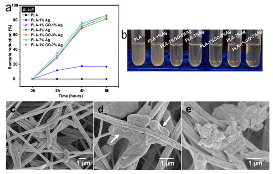 (a) Bacterial reduction percentage vs. time profiles for E. coli culture medium treated with PLA and its nanocomposite fibrous mats. The circular disk samples were soaked in the test tubes containing nutrient broth for E. coli (1 × 106 CFU/mL), and then placed in a rotary shaker at 37 °C for different time points. (b) Photograph of E. coli culture suspensions treated with PLA and its nanocomposite fibrous mats for 6 h. SEM images showing progressive loss of membrane integrity of E. coli attached on PLA/1 wt%GO-3 wt%AgNPs fibers for (c) 2, (d) 4, and (e) 6 h. White arrows indicate ruptured cell membranes. Reproduced with permission from [165], Copyright American Chemical Society, 2017.