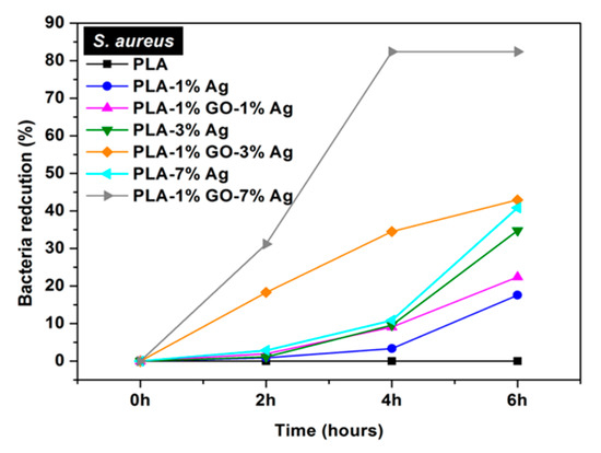 Bacterial reduction percentage vs. time profiles for S. aureus culture medium inoculated with electrospun PLA and its nanocomposite mats. Reproduced with permission from [165], Copyright American Chemical Society, 2017.
