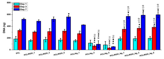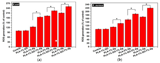 As described, the cell membrane disruption of E. coli is due to the direct contact with PLA/AgNPs and PLA/1 wt%GO-AgNPs nanocomposite fibers. As the AgNPs fillers are immobilized and embedded in the PLA matrix, it is considered that the released Ag+ ions from AgNPs fillers react with the thiol groups of bacteria for generating ROS [90]. The ROS generation is evaluated with the DCFH-DA assay in which 2,7-dichlorofluorescein diacetate (DCFH-DA) crosses the cell membrane. It is enzymatically cleaved by the esterase to yield nonfluorescent 2,7-dichlorofluorescein (DCFH). Further oxidation of DCFH by ROS converts the molecule to fluorescent 2,7-dichlorofluorescein (DCF) [168]. Figure 15a shows the ROS levels in E. coli treated with electrospun PLA and its nanocomposite fibers. Hybrid PLA/1 wt% GO-AgNPs mats induce high levels of ROS in E. coli. The PLA/3 wt% AgNPs and PLA/7 wt% AgNPs show slightly lower ROS levels compared with the hybrid mats. However, PLA/1 wt% GO mat exhibits low ROS level, being similar to that of PLA control. So the 1 wt% GO addition to PLA exerts no effect for bactericidal activity. In the PLA/1 wt% GO mat, the GOs are immobilized by the PLA matrix, so the polymer material seals sharp edges of graphene sheets, diminishing their role as nanoknives. Figure 15b shows that the ROS level in S. aureus treated with the PLA-based hybrids is also higher than that of PLA/AgNPs mat system. The ROS level in S. aureus treated with PLA/1 wt% GO mat is relatively low and similar to that of the PLA control.