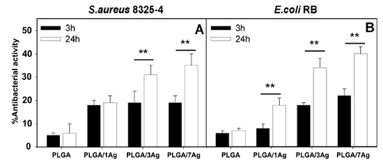 Antibacterial activity of dense PLGA and its PLGA/AgNPs nanocomposite films against (A) S. aureus and (B) E. coli incubated for 3 and 24 h at 37 °C. The percentage viability was determined by setting the bacterial cells grown onto the tissue culture plate (TCP) wells to 100%. Error bars indicated standard errors of the means, and ** denoted statistical significance, p < 0.01.