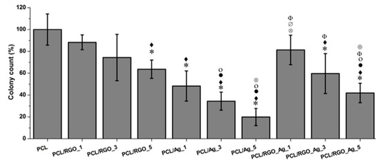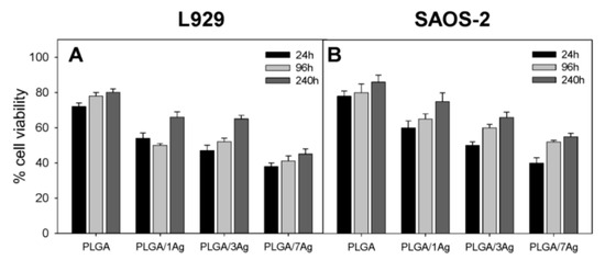 The degradation rate of PGA is relatively fast in aqueous solutions, thereby limiting its biomedical applications. Therefore, PGA is usually copolymerized with PLA to produce PLGA. More recently, Scavone et al. fabricated dense PLGA/AgNPs nanocomposite films with 1 wt%, 3 wt% and 7 wt% AgNPs by means of solvent casting [169]. The antibacterial activity of solvent-cast PLGA/AgNPs system was studied (Figure 16). Apparently, dense PLGA/AgNPs films exhibited a higher antibacterial resistance against E. coli and S. aureus over neat PLGA. The antibacterial activity of dense PLGA/AgNPs films derived from the released Ag+ ions, and increased with increasing AgNPs loadings. Figure 17A,B showed the MTT test results for murine fibroblasts (L929) and Saos-2 cultured on neat PLGA and its nanocomposite films. PLGA/7 wt% AgNPs nanocomposite film exhibited the lowest cell viability for L929 and Saos-2 cells, demonstrating cytotoxic effect of AgNPs with a high filler loading on mammalian cells. Rinaldi et al. also fabricated solvent-cast PLGA/(1–3 wt%) AgNPs nanocomposite films and examined their bactericidal activity against E. coli [170]. The antibacterial activity of PLGA/(1–3 wt%) AgNPs nanocomposite films increased with silver loading (Figure 18).
