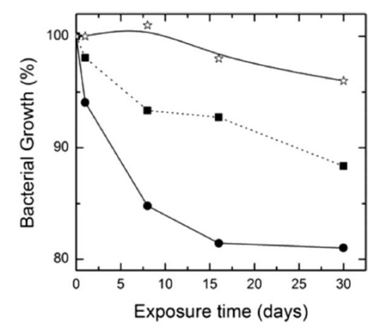 Bacterial growth vs. exposure time profiles of neat PLGA (star), PLGA/1 wt% AgNPs (square), and PLGA/3 wt% AgNPs (circle). Reproduced with permission from [170], Copyright Wiley, 2013.