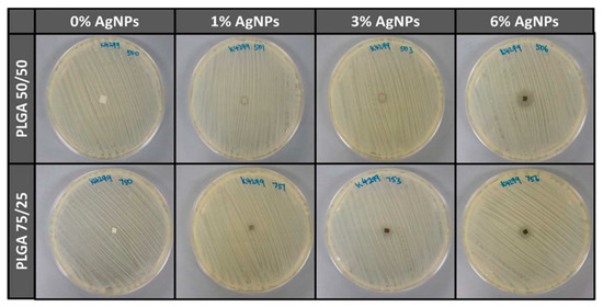 Almajhdi et al. electrospun PLGA/AgNPs fibrous mats containing 1 wt% and 7 wt% AgNPs [171]. They then assessed antibacterial activities of PLGA nanocomposite fibers against E. coli, S. aureus, Bacillus cereus, Listeria monocytogenes and Salmonella typhimurium using the disk diffusion technique. They reported that PLGA/7 wt% AgNPs mat exhibited inhibitory effect on all bacterial strains. Gora et al. incorporated 1, 3 and 6 wt% AgNPs into PLGA 50/50 and PLGA 75/25 fibrous scaffolds prepared by electrospinning [172]. PLGA 50/50 exhibited a much faster degradation rate than PLGA 75/25 due to its higher PGA content. The bactericidal activity of the fibrous mats was evaluated against P. aeruginosa, K. pneumoniae, S. saprophyticus, and E. coli. Both the PLGA nanocomposite scaffolds with 1 wt% AgNPs exhibited no antibacterial activity against S. saprophyticus, E. coli, and P. aeruginosa. Scaffolds contained AgNPs contents ≥ 3 wt% showed antibacterial properties for some strains when compared to neat PLGA 50/50 and PLGA 75/25 copolymers. Figure 19 showed the diffusion disk results against P. aeruginosa for PLGA 50/50 and PLGA 75/25 nanocomposite mats containing different AgNPs loadings. Apparently, the nanocomposite scaffolds with 6 wt% AgNPs were found to inhibit the bacterial growth effectively. However, nanocomposite scaffolds with 6 wt% AgNPs were more toxic to human dermal fibroblasts (HDFs) when compared with those filled with 1 wt% and 3 wt% of AgNPs (Figure 20).