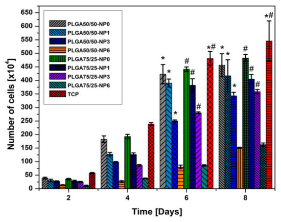 Proliferation of human dermal fibroblasts (HDFs) determined by AlamarBlue test. * Significant against cell proliferation on PLGA 50/50–6%AgNPs scaffold at p ≤ 0.05; # Significant against cell proliferation on PLGA75/25–6%AgNPs scaffold at p ≤ 0.05. NP: AgNPs. Reproduced with permission from [172], Copyright Wiley, 2015.