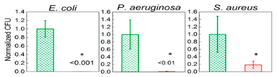 (Top Row) Number of attached live cells on PLGA-chitosan (green column) and PLGA-chitosan/GO-AgNPs (red column) mats upon exposure to E. coli, P. aeruginosa, and S. aureus bacteria. (Bottom Row) SEM images of E. coli (A,D), P. aeruginosa (B,E), and S. aureus (C,F) attached on the PLGA-CS (A–C) and PLGA-CS/GO-AgNPs (D–F) mats. * denotes statistically significant difference between PLGA-CS/GO-AgNPs and PLGA-CS (control); p < 0.05. Reproduced with permission from [173], Copyright American Chemical Society, 2015.