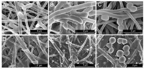 Recently, de Faria et al. electrospun PLGA/chitosan (CS) fibers of 356 nm diameter. The fibrous mat was subsequently functionalized with GO-AgNPs via a chemical reaction between the carboxyl groups of GO and the primary amine functional groups on the PLGA−CS fibers using 3-(dimethylamino) propyl-N′-ethylcarbodiimide hydrochloride and N-hydroxysuccinimide as cross-linking agents [173]. Figure 21 shows the bactericidal activity of PLGA-CS/GO-AgNPs and PLGA−CS (control) mats treated with E. coli, P. aeruginosa, and S. aureus strains for 3 h. The PLGA-CS/GO-AgNPs mat inactivates Gram-negative E. coli and P. aeruginosa over 98%, but with a lower bactericidal rate of 79.4 ± 6.1% against Gram-positive S. aureus. This is due to the difference in cell wall structures of bacterial strains. Comparing with intact bacteria on PLGA−CS fibers (Figure 21A–C), SEM images reveal that gram-negatives adhered on PLGA-CS/GO-AgNPs fibers disintegrate and lose their structural integrity (Figure 21D–F). The typical rod-shaped structure of Gram-negatives is destroyed, leaving only a small portion of cell debris. In contrast, few bacterial debris are seen in the SEM image of S. aureus (Figure 21F). Figure 22 shows the bactericidal activity of PLGA-CS/GO and PLGA−CS (control) mats treated with E. coli, P. aeruginosa, and S. aureus strains for 3 h. The bacteria populations remain almost unchanged by treating with PLGA-CS/GO mat. Furthermore, SEM micrographs reveal that all bacterial cells adhered on the PLGA-CS/GO samples remain intact (Figure 22A–C). There exists no membrane damage or a loss of structural integrity for the bacteria attached on these fibers. Hence, the GO sheets are ineffective to kill all bacteria strains studied. This is due to the GO sheets are covalently linked to the PLGA-CS fibers through a stable amide bond during the nanocomposite preparation [172]. Such a covalent amide bond restricts the mobility of GO sheets, thereby reducing their bactericidal effect through direct contact mechanisms.