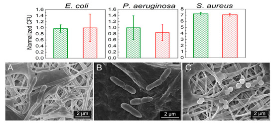 (Top Row) Number of attached live cells on PLGA-chitosan (green column) and PLGA-chitosan/GO (red column) mats upon exposure to E. coli, P. aeruginosa, and S. aureus bacteria. (Bottom Row) images of E. coli (A), P. aeruginosa (B), and S. aureus (C) attached on the PLGA-CS/GO samples. Reproduced with permission from [173], Copyright American Chemical Society, 2015.