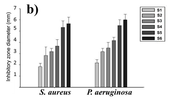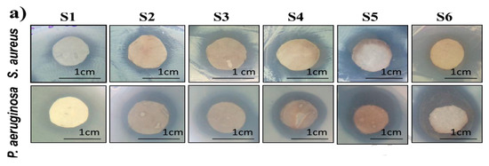 Images of S1, S2, S3, S4, S5 and S6 coated PCL mats showing (a) inhibition zones (b) zone diameters against S. aureus and P. aeruginosa. Reproduced with permission from [149]. Copyright Elsevier, 2018.