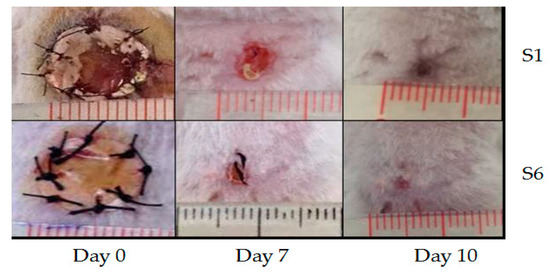 Photographs showing the contraction of dorsal wounds treated with S1 mat (top panel), and S6 mat (bottom panel) at day 0, day 7 and day 10, respectively. Reproduced with permission from [149]. Copyright Elsevier, 2018.