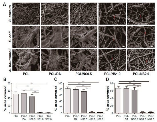 More recently, Liu et al. electrospun PCL fibrous mats, immersed them in a dopamine (DA) solution followed by final dipping in AgNO3 solutions of 0.5 mM, 1 mM and 2 mM concentrations [183]. Dopamine with its mussel adhesive behavior was used to reduce silver ions to AgNPs and then deposited them on the material surfaces [184]. The DA- and AgNO3-treated PCL mats of different silver salt contents were designated as PCL/DA, PCL/NS0.5, PCL/NS1.0 and PCL/NS2.0, respectively. The antibacterial activity of such coated scaffolds against S. aureus, E. coli and Acinetobacter baumannii was investigated. A. baumannii is a gram-negative bacterium that induces infections typically in intensive care units and healthcare settings for patients with weakened immune system. The nosocomial infections cause pneumonia, bacteremia, and skin diseases [185]. Figure 25A shows the effects of PCL, DA- and AgNPs-coated PCL mats upon exposure to three bacterial strains. Biofilm formation due to extensive bacterial colonization of those strains can be readily seen on the surfaces of PCL, PCL/DA and PCL/NS0.5 mats, especially gram-negative bacteria. In contrast, PCL/NS1.0 and PCL/NS2.0 mats are more effective to inhibit the biofilm formation. Very few bacteria as indicated by red arrows are found to attach on their surfaces. Furthermore, the areas covered by biofilms on the PCL/NS1.0 and PCL/NS2.0 mat surfaces are markedly smaller than those on the PCL, PCL/DA and PCL/NS0.5 surfaces (Figure 25B). The bacterial inhibitory effect of PCL mats is ascribed to the released Ag+ ions from coated AgNPs. However, PCL/NS2.0 mat can induce cytotoxicity in murine fibroblasts on the basis of Cell Counting Kit-8 (CCK8) assay results. This is attributed to a higher amount of Ag+ ions released from the PCL/NS2.0 fibrous mat over that from the PCL/NS0.5 and PCL/NS1.0 mats.