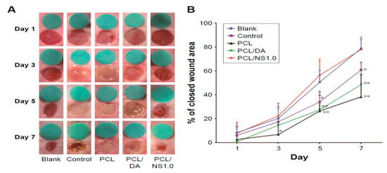 Electrospun fibers are versatile dressing materials with multiple functionality for wound treatment. The wound dressings should provide a suitable moisturized environment for healing by absorbing excess exudates, and killing bacteria. Very recently, Du et al. employed an electrospinning setup with two spinnerets to form PCL/polyvinyl alcohol (PVA) fibrous mats with a mixture of fibers, and loaded with AgNPs for mice wound healing [181]. Hydrolytic PVA maintains a moist wound environment to promote fibroblast adhesion, while PCL provides structural stability to impart mechanical strength to the resulting mats. Neat PCL/PVA fibrous mat is ineffective in inhibiting E. coli and S. aureus growth as expected. Hybrid PCL/PVA-AgNPs mat exhibits good bactericidal activity against E. coli and S. aureus. MTT assay using murine fibroblasts (NIH-3T3) revealed that the cell viability reduces considerably in hybrid PCL/PVA-AgNPs mat compared to neat PCL/PVA. Furthermore, the wound treated with hybrid PCL/PVA-AgNPs mat heals faster than that with neat PCL/PLA on the basis of in vivo wound healing test using a rat model.