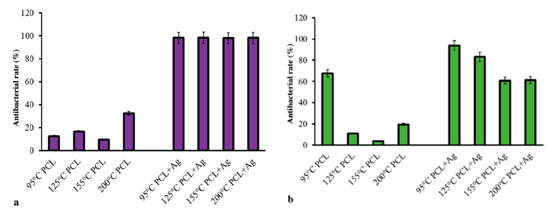 Several researchers prepared antimicrobial PLA/AgNPs nanocomposites using solvent casting and melt compounding techniques [152,153,154]. Shameli et al. fabricated solvent-cast PLA/AgNPs nanocomposites containing 8, 16 and 32 wt% AgNPs [152]. They reported that PLA/AgNPs nanocomposite films exhibited a strong antibacterial activity against Gram-negative E. coli and Vibrio parahaemolyticus, and gram-positive S. aureus. The antibacterial efficacy of PLA/AgNPs films towards those bacterial strains increased with increasing AgNPs content. As the AgNPs were immobilized by the PLA matrix, so their penetration into cytoplasm was restricted. The bactericidal effect of those nanocomposite films was attributed to the silver ions released from AgNPs. The amount of released silver ions from PLA/AgNPs nanocomposite films in the phosphate-buffered saline (PBS) solution was found to increase with increasing AgNPs content.